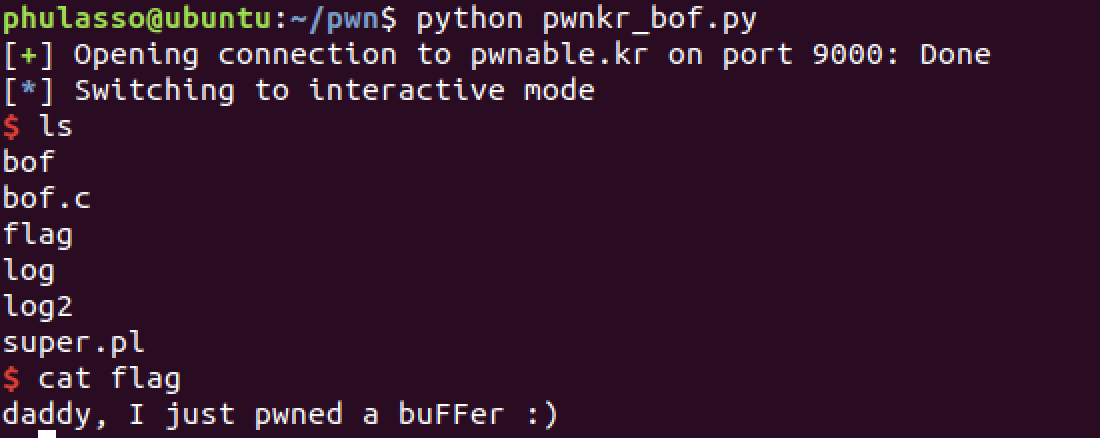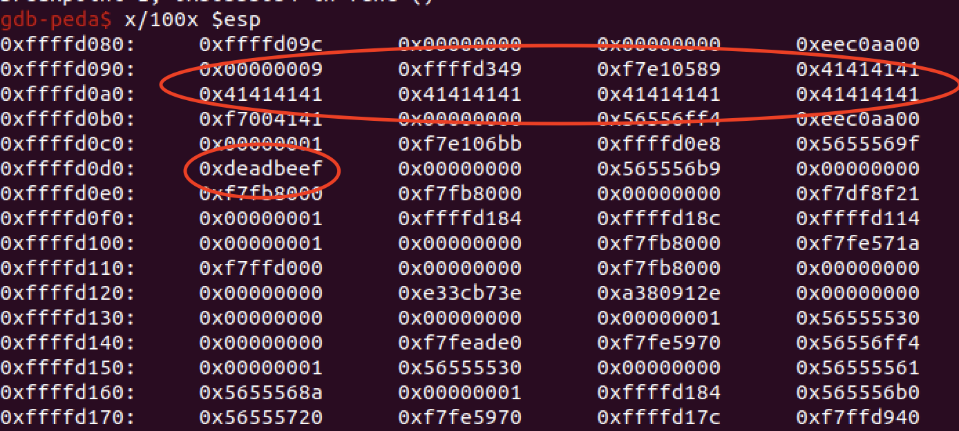 입력값이 들어가는 부분의 시작 위치는 0xffffd09c 이고, 0xdeadbeef의 시작점은 0xffffd0d0이므로 0xffffd0d0 - 0xffffd09c는 10진수로 52이다. 따라서 52만큼 다른 값을 채우고, 0xcafebabe를 리틀엔디언 형식으로 넣으면 쉘을 딸 수 있을 것 같다.