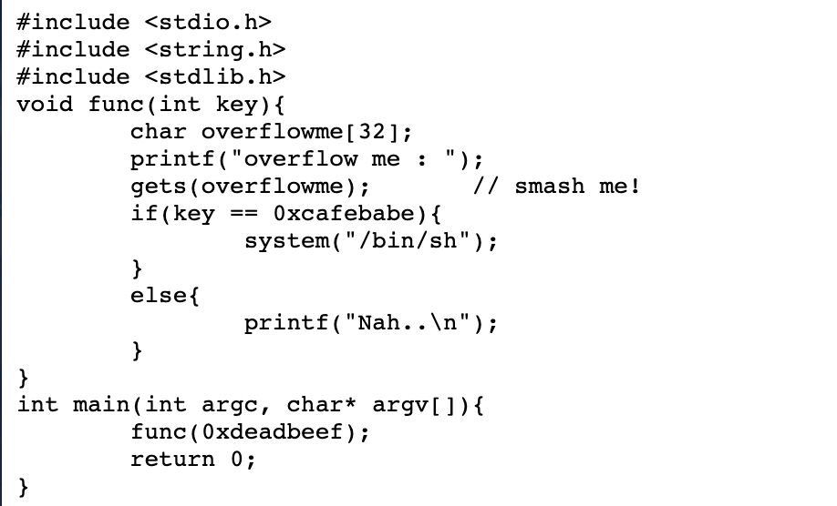 main 함수에서는 func함수를 실행하고 있고, func 함수에서는 key를 인자로 받고 있고, key 값이 0xcafebabe면 system 함수로 쉘을 실행하고 있다. overflow 변수에 값을 입력받는데, overflow의 크기는 32바이트인데, 입력받는 곳에서 크기의 제한을 하고 있지 않아서 bof 취약점이 발생할 것 같다. gdb로 main 함수와 func 함수를 보면 다음과 같다.
