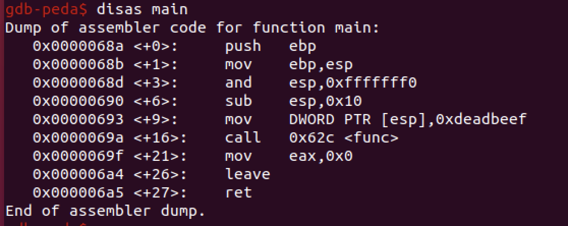 넣어준 값과 main함수에서 func를 실행할 때 인자로 넣은 0xdeadbeef의 위치를 확인할 수 있다. 0xdeadbeef가 있는 위치까지 입력값으로 덮고 0xcafebabe를 덮으면 조건을 만족시켜 system함수를 실행시킬 수 있을 것 같다.