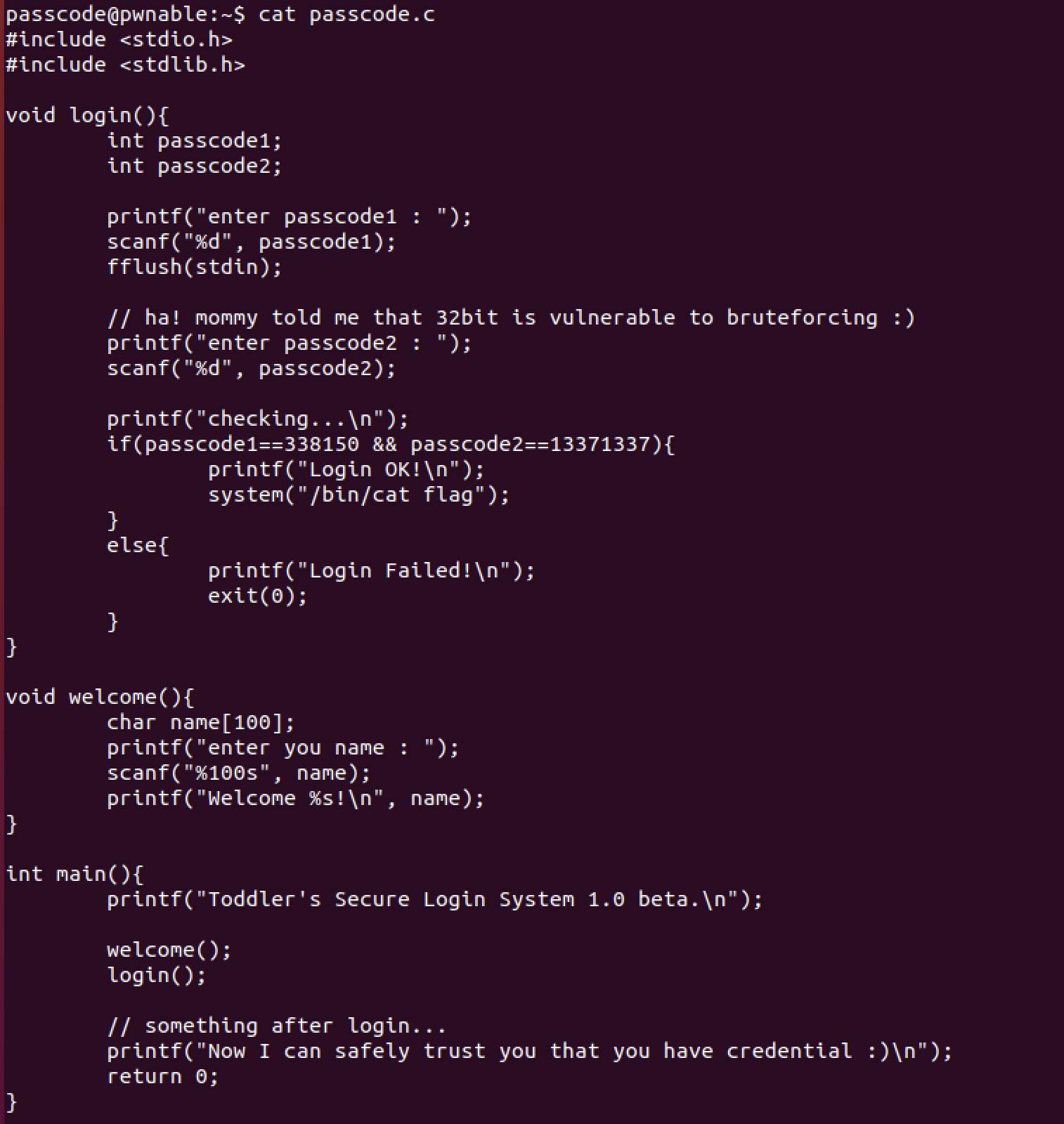 서버에 접속하여 passcode.c 파일을 보면 다음과 같다.