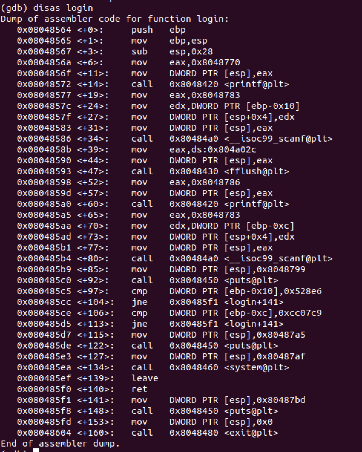 welcome함수와 login함수를 gdb로 보면 다음과 같다.