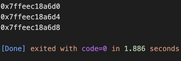 정수형 배열을 선언하고, 배열을 포인터에 할당하였다. 메모리 주소에 1씩 더하면 포인터 자료형의 크기만큼 더하거나 빼져서 위의 경우 int형 배열이였기 때문에 4씩 더해졌다.
