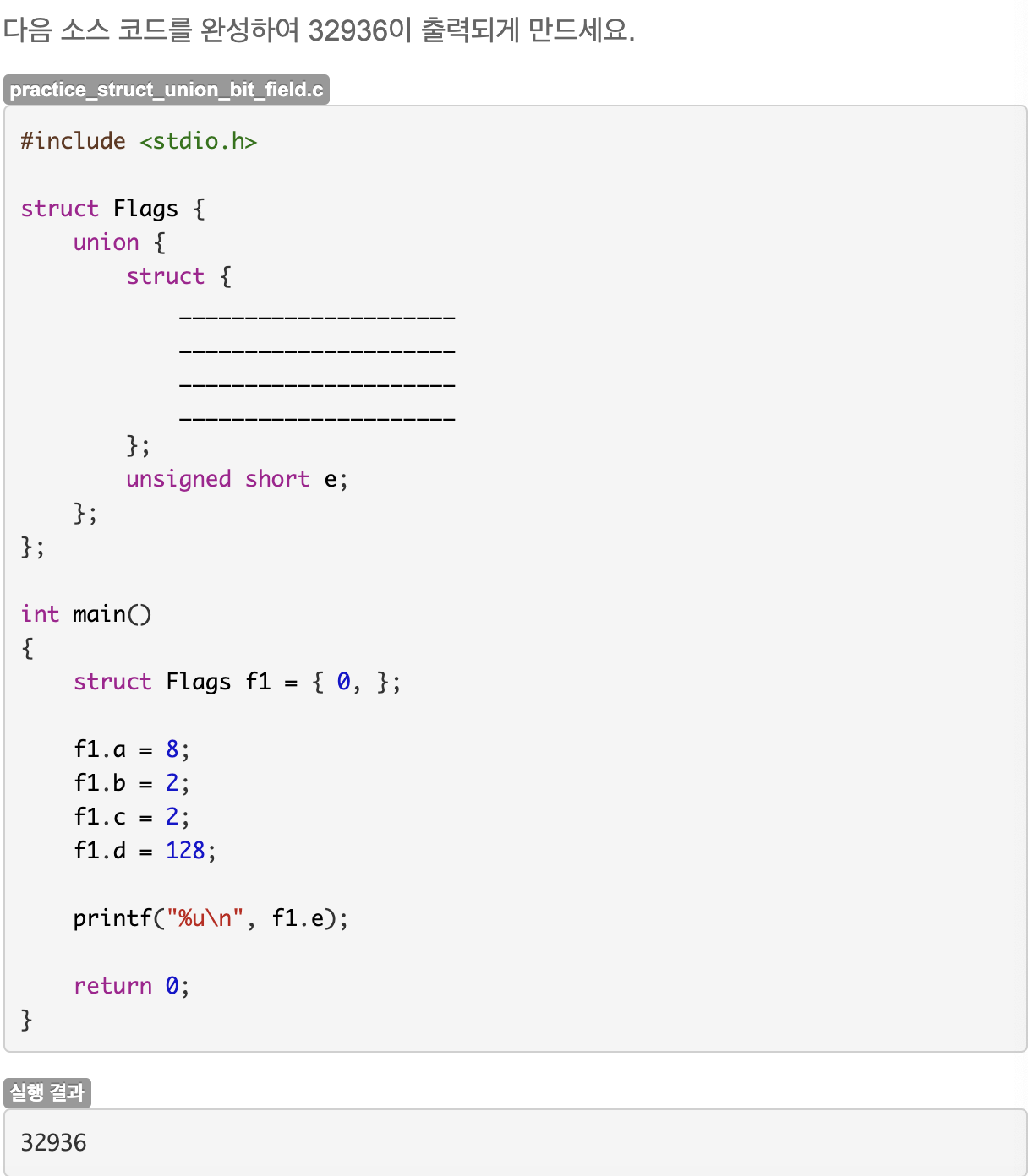 비트 필도로 사용할 멤버는 익명 구조체로 감싸주고, 비트 필드의 값을 한번에 접근할 수 있는 unsigned short형 멤버(e)를 선언하여 익명 공용체로 감싸준다. 각 비트 필드에 값을 할당하고, e를 출력하면 64020이 나온다. 각 비트 필드에 할당한 비트들을 차례로 연결하면 1111 1010000 10 100이 되어 10진수로 64020이 된다.