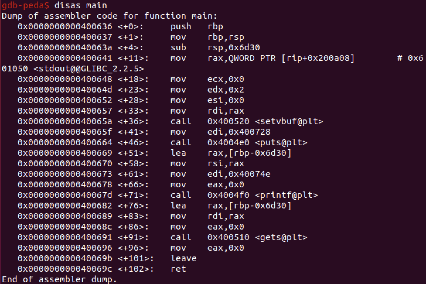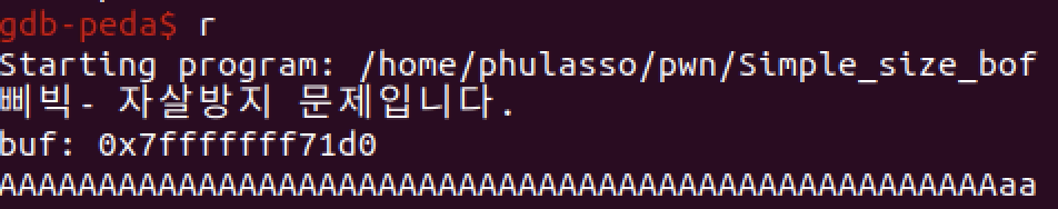 gets함수가 끝난 main+96에 bp를 걸고 값을 입력하면 파일을 실행할 때 출력하는 buf 주소와 입력한 값이 들어간 주소가 동일함을 확인할 수 있다.