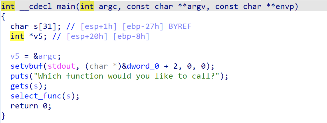 main 함수에서는 문자열을 입력받고 있고, 입력받은 문자열을 인자로 하여 select_func()함수를 실행하고 있다.