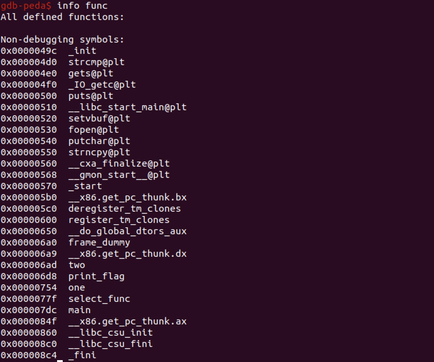 작성된 함수는 two, print_flag, one, select_func, main 함수 인 것 같다.