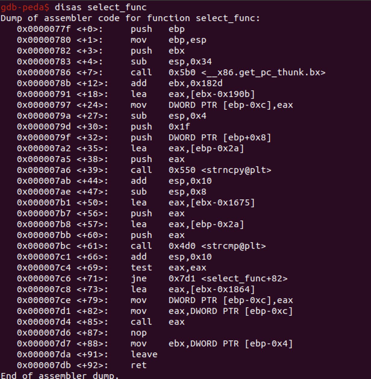 select_func+85를 보면 call로 eax를 호출하고있다. select+85에 bp를 걸고 실행하면 다음과 같다.
