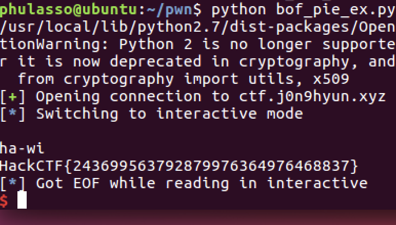 따라서 18(v1 크기) + 4(ret까지 거리)만큼 입력값을 채우고 welcome 주소값을 이용하여 j0n9hyun 함수의 주소를 구해서 넣으면 j0n9hyun 함수를 실행시킬 수 있다. 이 과정을 익스 코드로 작성하면 다음과 같고, 이 익스 코드를 실행하면 플래그를 얻을 수 있다.