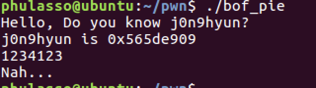 문제 파일은 PIE보호기법이 적용되어 있기 때문에 실행할 때 마다 함수의 주소가 바뀌지만 상대적인 위치는 동일하므로 출력되는 welcome 함수의 주소를 통해 j0n9hyun함수의 주소값을 구할 수 있다. welcome 함수와 j0n9hyun함수는 0x909 - 0x809로 121 만큼 위치 차이가 난다.
