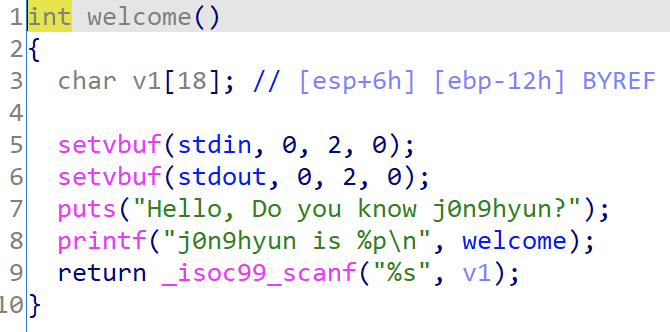 j0n9hyun 함수는 flag 파일의 내용을 읽어와 출력하고 있고, welcome 함수는 welcome함수의 주소값을 출력하고, scanf함수를 반환하여 사용자로부터 값을 입력받고 있다. main 함수는 welcome 함수를 호출하고 있다.