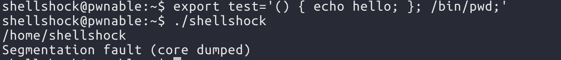 pwd 명령어를 실행하도록 입력하였더니 shellshock 에서 bash명령을 실행할 때 등록된 환경변수를 읽어와서 pwd명령을 실행한 결과를 보여준다. 따라서 다음과 같이 flag를 출력하도록 하고 ./shellshock를 실행하면 shellshock_pwn 계정의 권한으로 flag를 읽은 결과를 출력해준다.