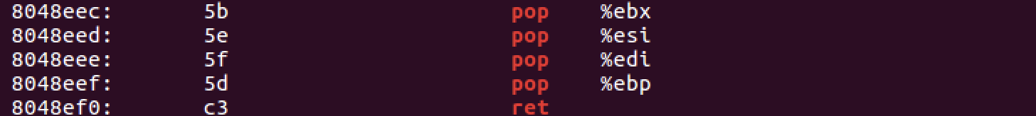 이제 ROP 공격을 하기 위해 가젯을 찾아야 하는데 recv함수를 이용하려면 인자를 4개를 넣어줘야하기 때문에 pop이 4개있는 가젯을 찾으면 다음과 같다.