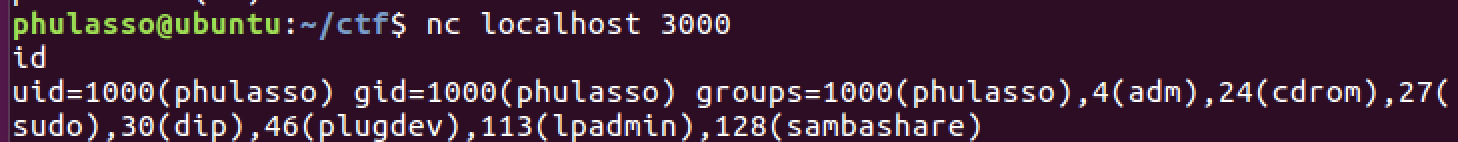 코드를 실행시키고 nc로 접속하면 다음과 같이 쉘이 따진것을 확인할 수 있다.