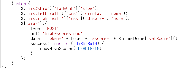 저기에 BTunnelGame['getScore']() 를 지우고 목표 점수인 31337으로 수정한후