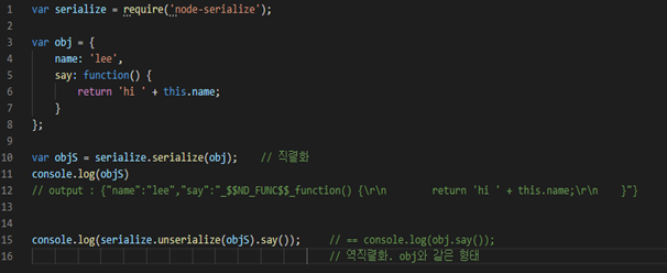 자바스크립트에서 직렬화를 하기 위해 node-serialize 라는 모듈을 사용하겠다.