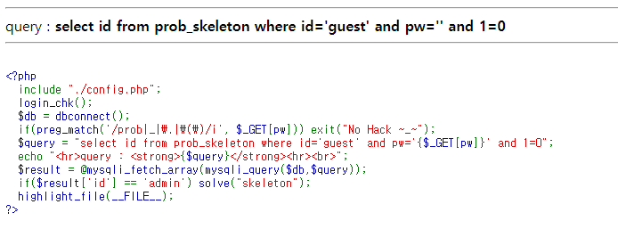 문제를 보면 쿼리 맨 뒤 부분에 and 1=0 이라는 구문이 있어 쿼리가 거짓이 되고 있다. 이 부분을 주석처리를 통해 없애주면 문제를 해결할 수 있을 것 같다. /?pw=' or id='admin'# 이라는 쿼리를 보냈더니 #문자가 들어가지 않아서 #을 헥스값으로 바꾼 %23으로 넣었더니 정상적으로 주석처리가 되며 쿼리가 참이 되서 문제를 해결할 수 있었다.
