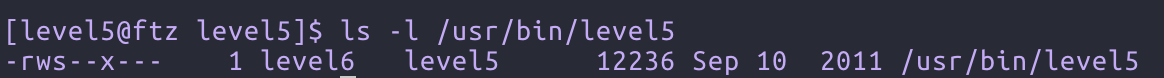 힌트의 level5 파일은 level6 계정 권한으로 setuid가 걸려있음을 확인할 수 있다.