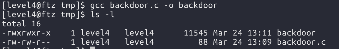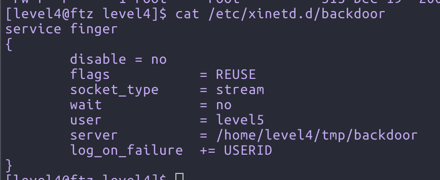 finger 이라는 서비스를 통해 level5의 권한으로 /home/level4/tmp/backdoor이라는 서버 파일을 실행한다.