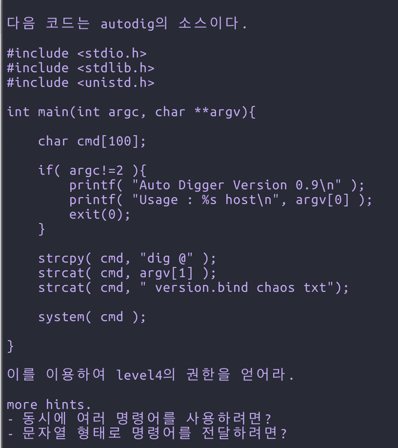 autodig를 실행하고 인자로 ";/bin/bash;"를 넣어주면 level4의 쉘을 딸 수 있고, my-pass 명령어로 비밀번호를 확인할 수 있다.