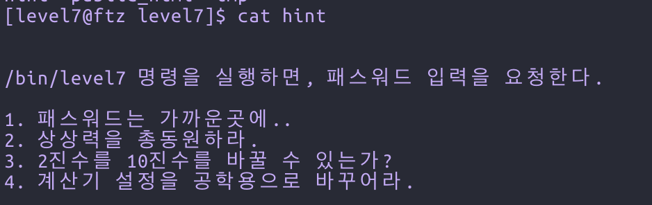다시 level6 계정으로 접속해서 힌트만 보이는 화면에서 ctrl + c를 누르면 현재 프로그램이 강제 종료되고 프롬프트가 나온다. 파일 목록을 확인해보면 password 파일이 있고 password파일을 확인해보면 level7계정의 비밀번호를 알아낼 수 있다.