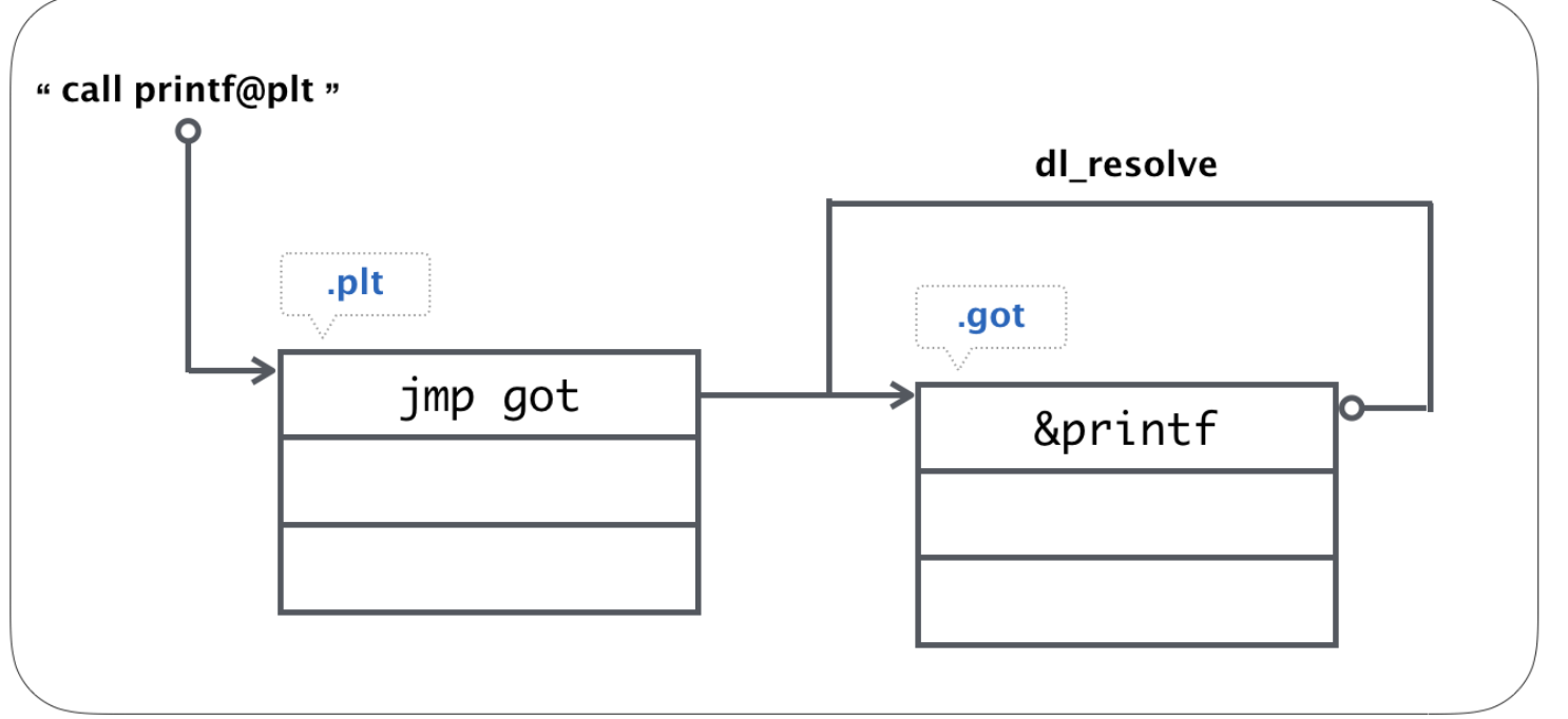 두 번째 호출일 경우 GOT에 실제 함수의 주소가 쓰여있지만, 첫 번째 호출이면 GOT에 실제 함수의 주소가 쓰여있지 않다. 첫 번째 호출시는 Linker가 dl_resolve라는 함수를 사용하여 필요한 함수의 주소를 알아오고 GOT에 그 주소를 써준 후 해당 함수를 호출한다.
