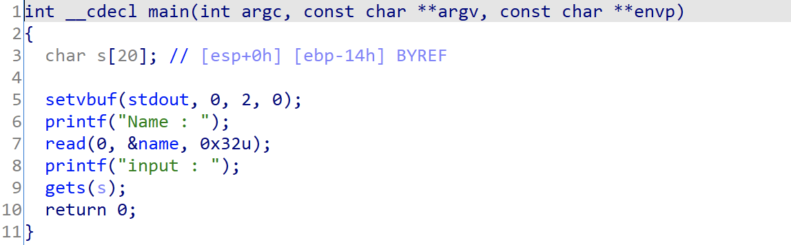 20크기의 배열이 선언되어 있고, gets 함수를 통해서 s에 값을 입력받는다. 입력받을 때 입력받는 값을 제한하지 않아서 bof 가 발생할 수 있다. 프로그램 내부에 시스템 함수가 없어서 쉘 코드를 넣어야 하는데 s는 크기가 20밖에 안되서 전역변수 name을 사용해야 할 것 같다.