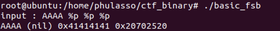 또한 다음과 같이 프로그램을 실행시키고 포맷 스트링을 입력하여 FSB 취약점이 있다는 것을 확인할 수 있다.