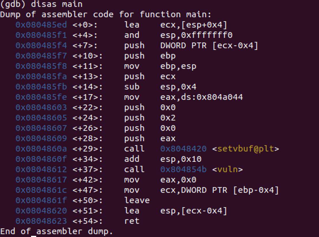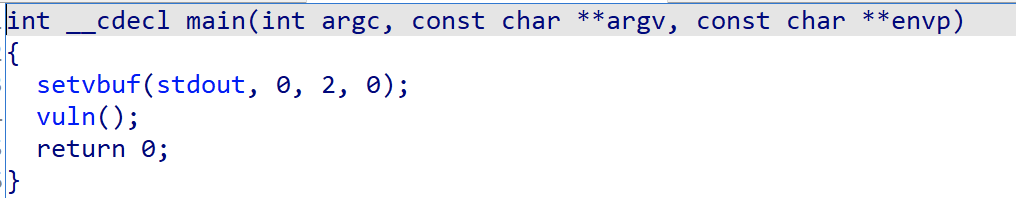 setvbuf 함수와 vuln 함수만 실행되고 있고, 어셈블리 코드에서 setvbuf 함수가 실행되기 전에 push 됬던 값들이 setvbuf 함수의 인자로 들어가고 있다.