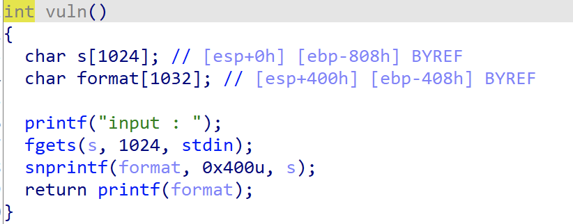 vuln 함수에서 값을 입력받고, 입력받은 값을 출력해준다. 그리고 format 출력을 반환한다. snprintf는 버퍼 오버플로우를 막기 위해 두번째 인자로 문자열의 길이를 지정하는 함수라고 한다.