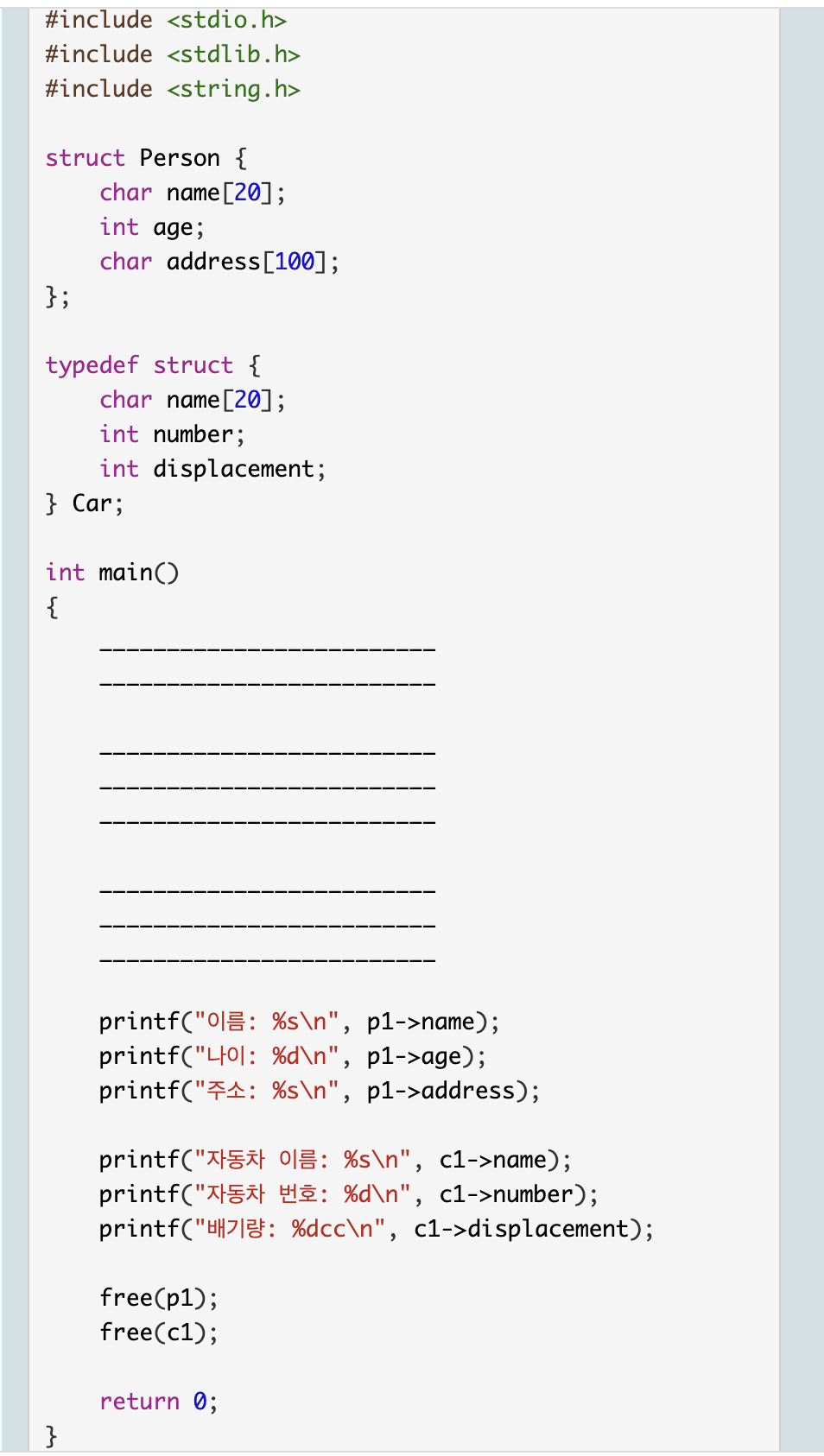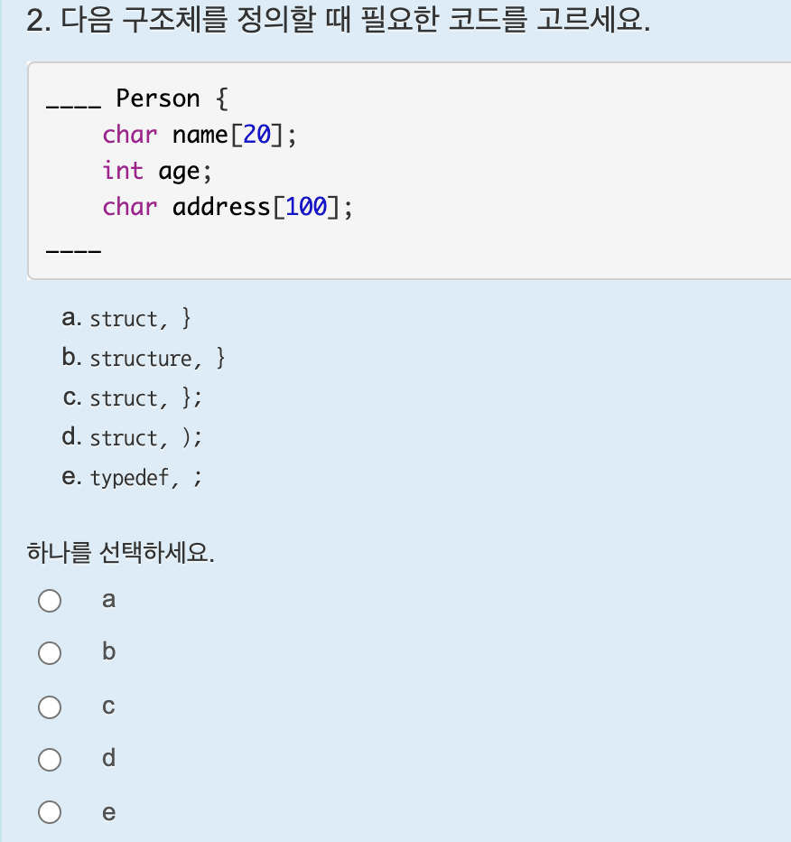 다음은 인적 정보를 표현하는 구조체를 만들고 사용한 것이다.