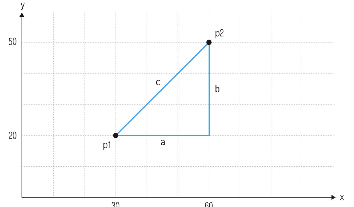 두 점 사이의 거리를 구하려면 피카고라스의 정리를 이용하면 된다.