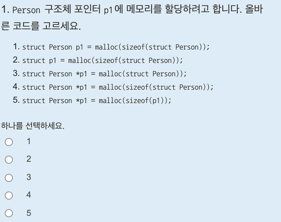 구조체별칭 *포인터이름 = malloc(sizeof(구조체별칭)); 의 형태로 포인터를 선언하고 메모리를 할당할 수 있다.