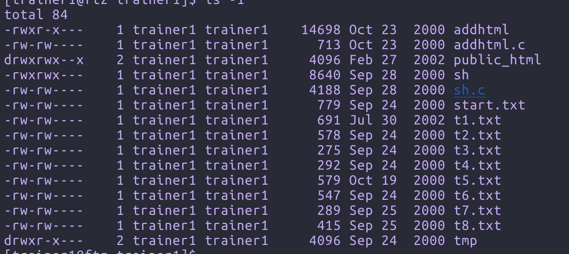 각 파일마다 구분되어 있는 필드에는 파일이 생성된 날짜 정보가 있고, 14698 같은 숫자들은 파일의 용량이다. tranier1 trainer1 과 같은 내용을 퍼미션에 관련한 정보이며 맨 첫번째 필드가 파일의 모드와 성격 정보를 가지고 있는데 가장 왼쪽의 문자가 - 면 일반 파일이고, d이면 디렉터리를 의미한다.
