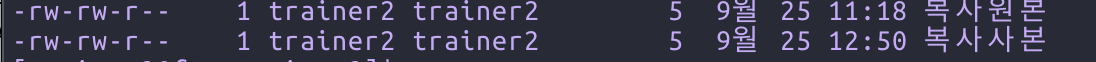 파일을 삭제하는 명령어는 rm이다. rm 복사사본을 입력하고 ls 명령어로 확인하면 파일이 삭제됨을 확인할 수 있다.
