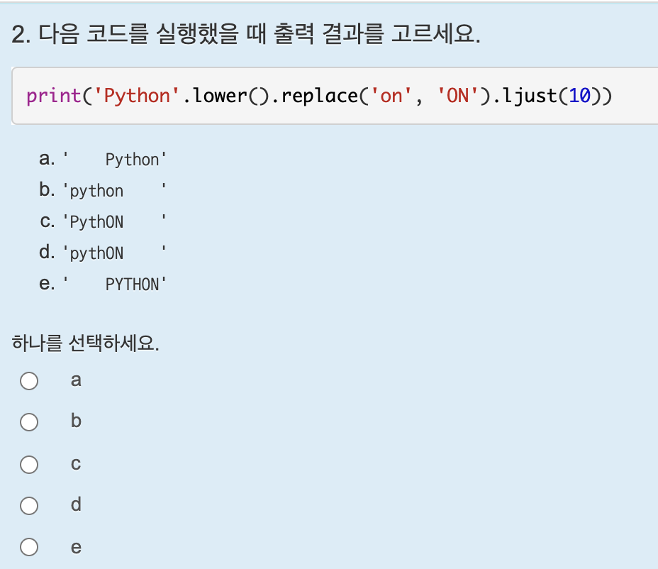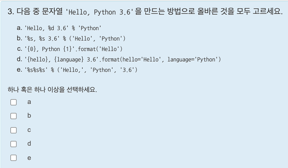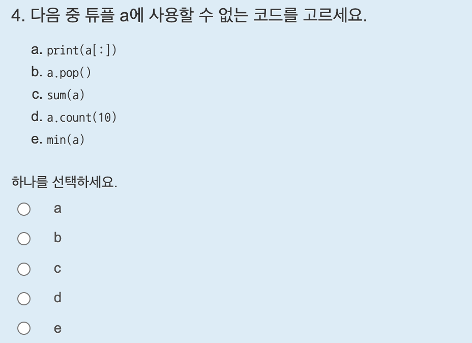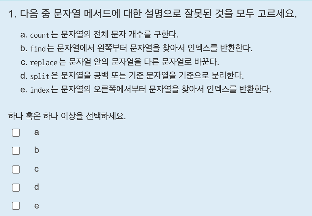 정답은 a, e 이다. count 는 문자열에서 지정한 문자열이 몇번 나오는지 세는 메서드이고, index는 왼쪽에서부터 찾는다.