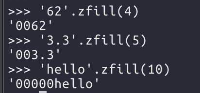 zfill(길이)는 지정된 길이에 맞춰서 문자열의 왼쪽에 0을 채운다. 문자열의 길이보다 지정된 길이가 작다면 아무것도 채우지 않는다. 보통 숫자를 일정 자리수로 맞추고 앞자리를 0으로 채울 때 사용한다.