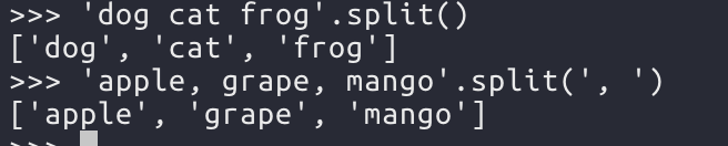 위의 경우 콤마와 쉼표를 기준 문자열로 지정해서 ', '을 분리하여 단어만 리스트로 만든다.