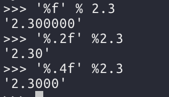 실수를 넣을 때는 %f를 사용하며 고정 소수점의 f이다.(Fixed point) %f는 기본적으로 소수점 이하 6자리 까지 표현하며, 소수점 이하 자리수를 지정하고 싶으면 f 앞에 .(점)자리수 를 지정해주면 된다.