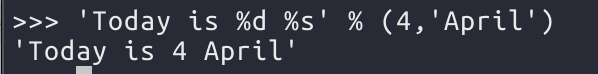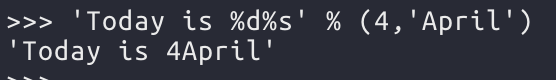 문자열 앞에 값을 두 개 이상 넣으려면 %를 붙이고, 괄호안에 값(변수)을 콤마로 구분해서 넣으면 된다. 괄호로 값을 묶지 않으면 에러가 발생한다.