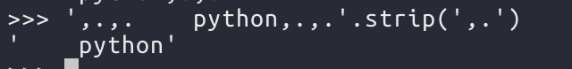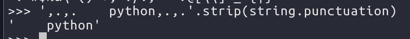 다음과 같이 strip()메서드에 string.punctuation을 넣어주면 문자열 양쪽의 모든 구두점을 삭제할 수 있다.