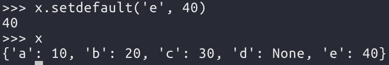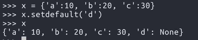 setdefault(키)는 딕셔너리에 키-값 쌍을 추가한다. setdefault에 키만 지정하면 값에 None을 저장한다.