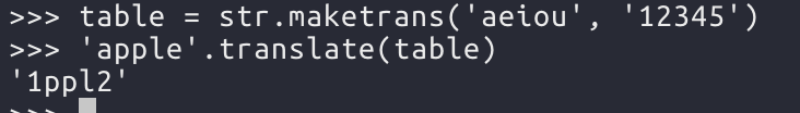 translate는 문자열 안의 문자를 다른 문자로 만든다. 이것을 사용하기 위해서는 먼저 str.maketrans('바꿀 문자', '새 문자')로 변환 테이블을 만든다. 그 후 translate(테이블)을 사용하면 문자를 바꾼 뒤 결과를 반환한다.