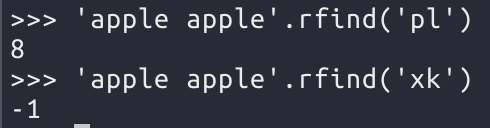 rfind('찾을 문자열')은 문자열에서 해당 문자열을 오른쪽에서부터 찾아서 찾으면 위치 인덱스를 반환하고, 없으면 -1을 반환한다. 같은 문자열이 여러개인 경우 먼저 찾은 인덱스를 반환한다.