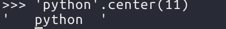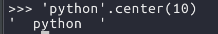 center(길이)는 문자열을 지정한 길이로 만들고, 가운데 정렬하며 남는 공간은 공백으로 채운다. 다음의 경우 문자열의 길이를 10으로 만들어 가운데로 정렬한 뒤 양 옆의 남은 공간은 2칸씩 채운다.