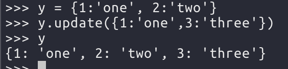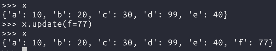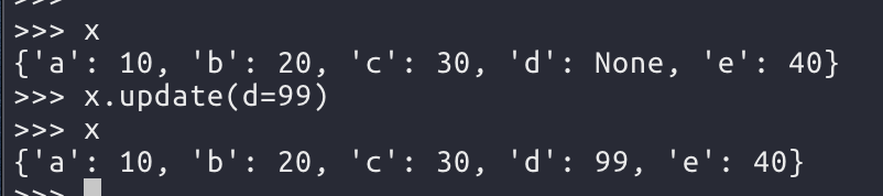 update 메서드를 사용하면 값을 수정할 수 있다. update(키=값)으로 값을 수정한다. 키는 큰따옴표나 작은따옴표는 빼고 쓴다.