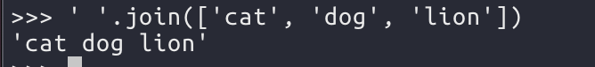 리스트로 분리된 문자열을 다시 연결하여 문자열로 만드는것도 가능하다. join(리스트)로 구분자 문자열과 문자열 리스트의 요소를 연결하여 하나의 문자열로 만든다. 다음은 공백 ' '에 join을 사용하여 각 문자열 사이에 공백이 들어가도록 한 것이다.