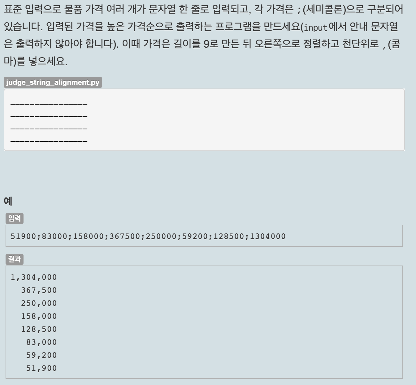 입력값을 정수로 된 리스트로 만들고, 내림차순으로 정렬한다. 이후 반복문으로 모든 요소들을 9자리로 만들고, 오른쪽으로 정렬하고, 천 단위로 콤마를 붙인다.