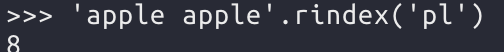 rindex('찾을 문자열')은 오른쪽에서부터 특정 문자열을 찾아서 인덱스를 반환한다. 문자열이 없으면 에러를 발생시키며, 해당 문자열이 여러개일 경우 처음 찾은 문자열의 인덱스만 반환한다.