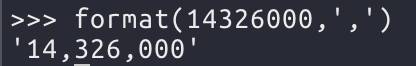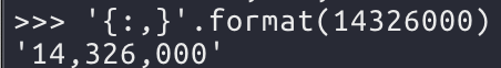금액을 표현하기 위해 천 단위로 구분할때 format()함수에 숫자와 콤마를 넣어 간편하게 구분할 수 있다.
